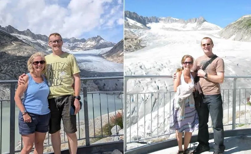 Wysokie temperatury mają wpływ na lodowiec Rodanu w Szwajcarii. Post na platformie X, opublikowanym przez brytyjską parę, wywołał nie małe zdziwienie internautów. Para zestawiła zdjęcia z lat 2009 i 2024. Zobaczyło to już ponad 4,5 miliony użytkowników. Małżeństwo pozuje na platformie widokowej na lodowcu Rodanu, gdzie w 2009 roku słońce pięknie lśniło odbijając się od lodu.