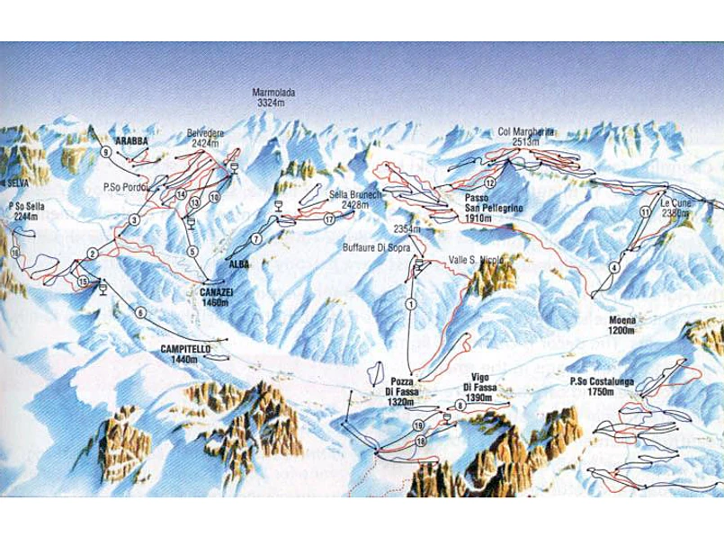 Val di Fassa znajduje się między Gruppo Sella i Sassolungo. Trasy narciarskie rozciągają się między miejscowościami Canazei, Pozza di Fassa i Moena. Oprócz Marmolady i Sella Ronda jest tu również słynna trasa Ciampac.